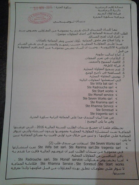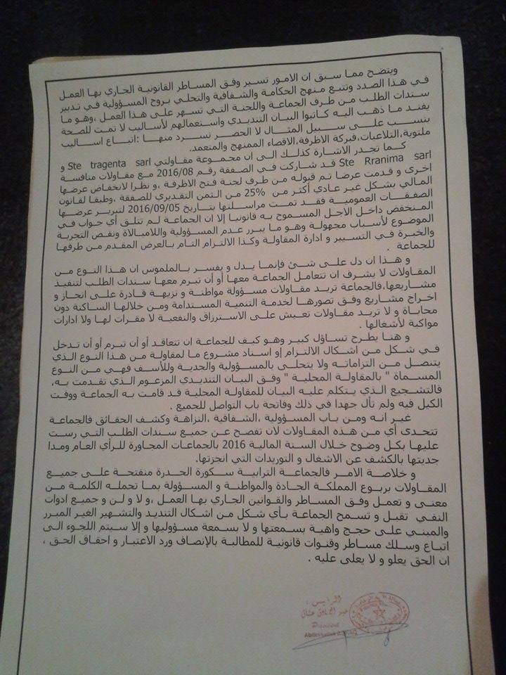 وبحسب ذات المسؤول في بيان توضيحي توصلت جريدة فور تنمية بنسخة منه فإن عملية تمرير سند الطلب تمت وفق الضوابط والمساطر القانونية المعمول بها . وحيت ان الجماعة وفق ذات البيان لايمكنها أن تتعامل مع عدد من المقاولات الغير المسؤولة التي سبق واخلت بإلتزماتها في صفقات فائتة فإن مجلس الجماعة وعلى رأسه الرئيس قرر أن يعمل وفق ماتفرضه مصلحة الجماعة وما يمنحه القانون المنظم من صلاحيات.