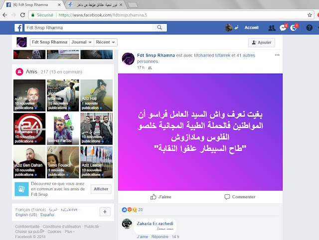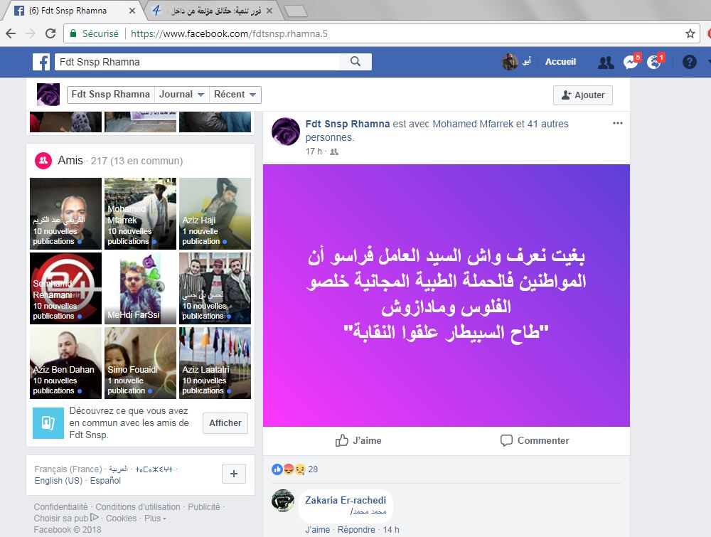 كشفت النقابة الوطنية للصحة فدش بالرحامة على صفحتها الفيسبوكية أن مواطنين قد دفعوا مبالغ مالية لم تحددها لجهات ما من أجل الاستفاذة من الحملة الطبية الجراحية الاخيرة دون أن يستفيذوا.