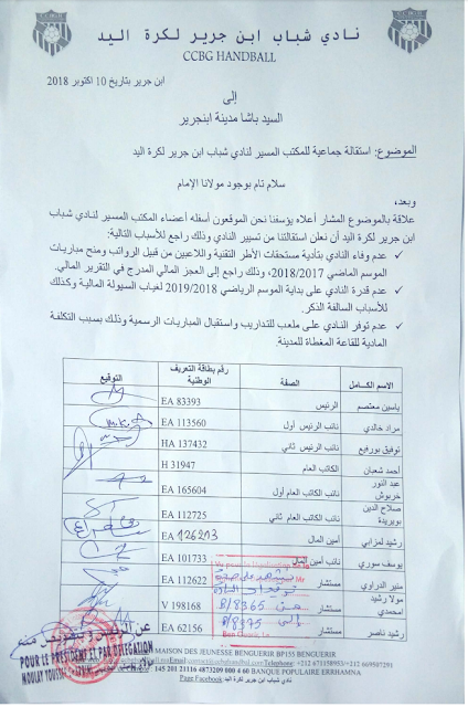 وضع صباح اليوم الاربعاء عاشر أكتوبر أعضاء المكتب المسير لنادي شباب بنجرير لكرة اليد استقالة جماعية لدى السلطات المحلية التي رفضتها جملة وتفصيلا .