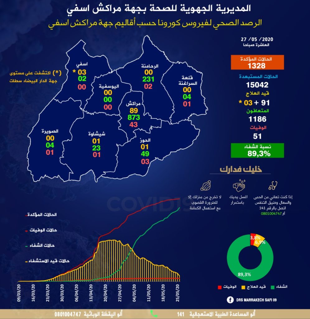 وبخصوص الوفيات جراء الفيروس بالجهة، فقد بلغت 51 حالة وفاة، موزعة بين عمالة مراكش (43) وإقليمي الحوز (3) والرحامنة (2)، وحالة وفاة واحدة بكل من أقاليم شيشاوة وقلعة السراغنة والصويرة.