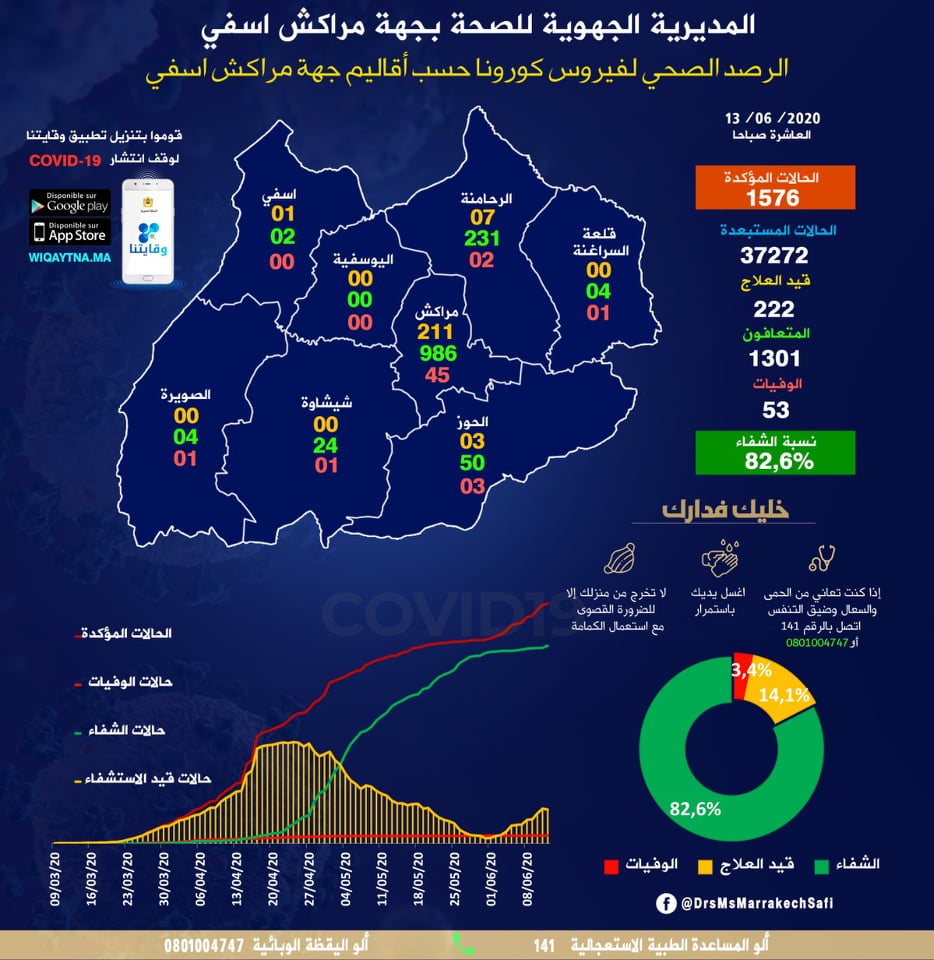 وأصبحت أقاليم قلعة السراغنة والصويرة وشيشاوة خالية من الوباء بعد تماثل حالات الإصابة للشفاء، فيما ظل إقليم اليوسفية خاليا من أية إصابة منذ ظهور الوباء بالجهة.
