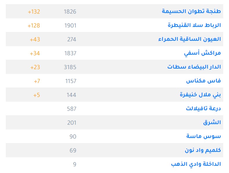 وتتوزع الاصابات الجديدة المسجلة خلال ال 16 ساعة الماضية على جهة طنجة ب 132 اصابة جديدة بسبب بؤرة مهنية تليها جهية الرباط بـ 128 اصابة جديدة ، و 43 اصابة بجهة العيون ، و 34 اصابة جديدة بجهة مراكش، و 23 حالة بجهة الدار البيضاء، و 7 بمكناس، و 5 حالات بجهة بني ملال.