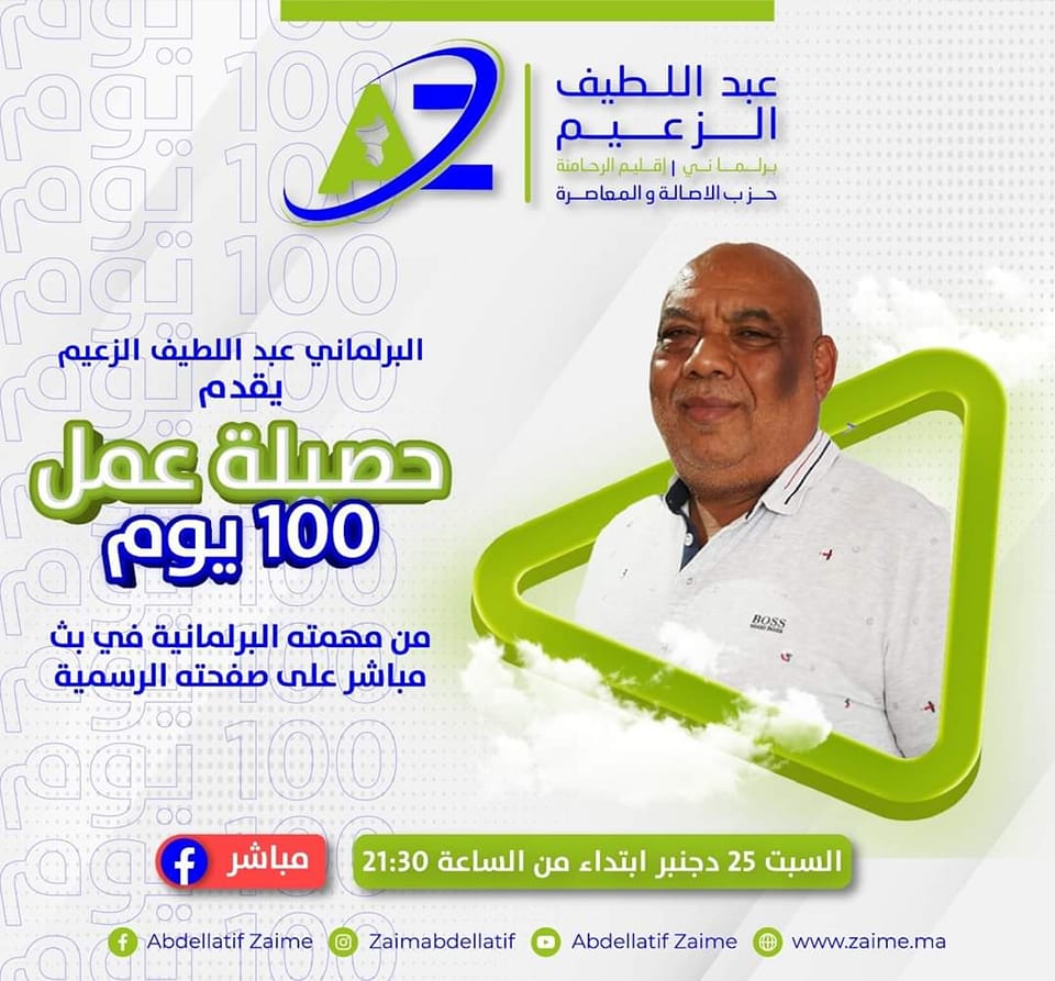 كشفت الصفحة الرسمية على الفيسبوك  لبرلماني حزب الأصالة والمعاصرة  عبد اللطيف الزعيم عن  تقديمه يوم غد السبت ابتداءا من الساعة التاسعة مساء بتقنية المباشر لحصيلة مهامه بقبة البرلمان خلال 100 يوم.