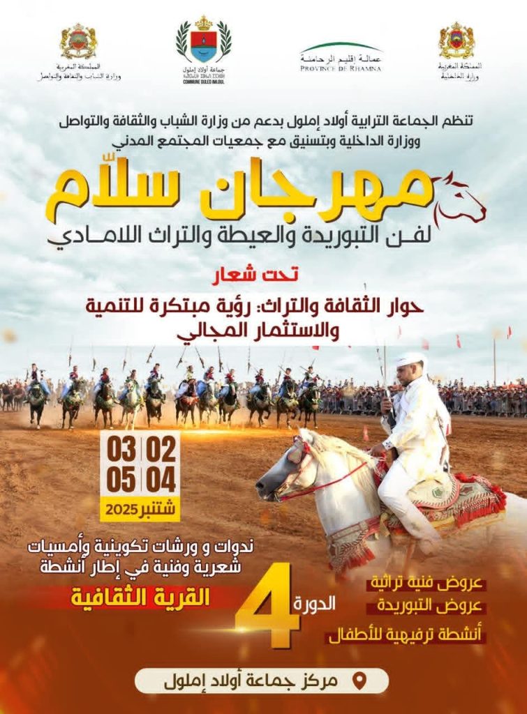 في إطار فعاليات الدورة الرابعة من مهرجان سلام للتبوريدة والعيطة والتراث اللامادي، المزمع تنظيمه بجماعة أولاد إملول بإقليم الرحامنة ما بين 2 و5 شتنبر 2025، تحت شعار: “حوار الثقافة والتراث… رؤية مبتكرة للتنمية والاستثمار المجالي”، تبرز القرية الثقافية كإحدى أبرز الفضاءات المبتكرة التي ستمنح للمهرجان هذا العام بعداً جديداً يتجاوز الطابع الاحتفالي نحو أفق فكري وتنموي.