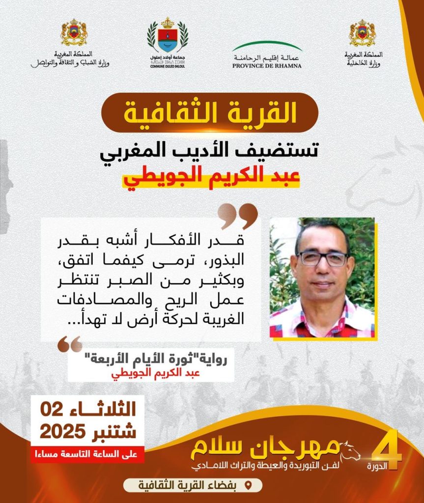 في إطار برنامجه الثقافي والفكري، يتهيأ مهرجان سلام للتبوريدة والعيطة والتراث اللامادي بجماعة أولاد إملول، لتنظيم  لقاء مفتوح مع الروائي المغربي عبد الكريم الجويطي، وذلك ضمن فعاليات القرية الثقافية التي تشكل القلب النابض للدورة الرابعة للمهرجان، المزمع تنظيمها ما بين 2 و5 شتنبر 2025.
